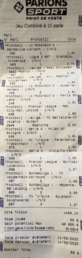 15 paris dans 7 championnats pour un gain total de 96 955 € de gains, ça fait rêver non ? >On note les 25 k de bonus grâce au Combi boosté !En poursuivant votre navigation, vous acceptez l'utilisation de cookies afin de réaliser des statistiques d'audience et vous proposer des services et offres adaptés à vos centres d'intérêts.