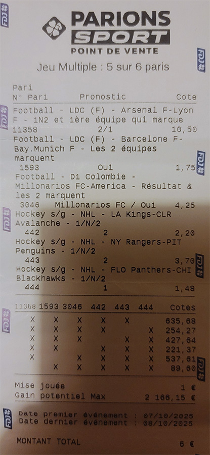 bouguiman récidive avec la même cote mais cette fois ci avec 6 € de mise pour le double de gain